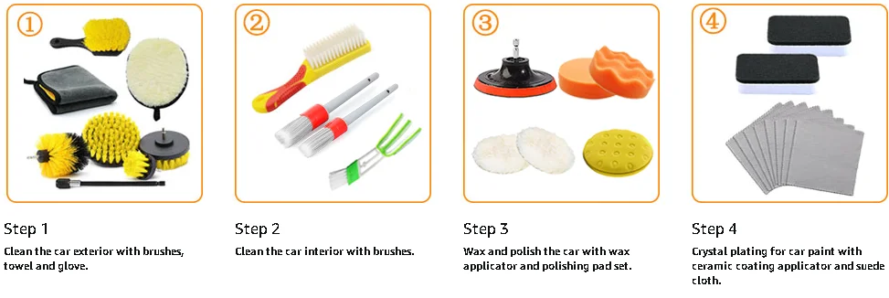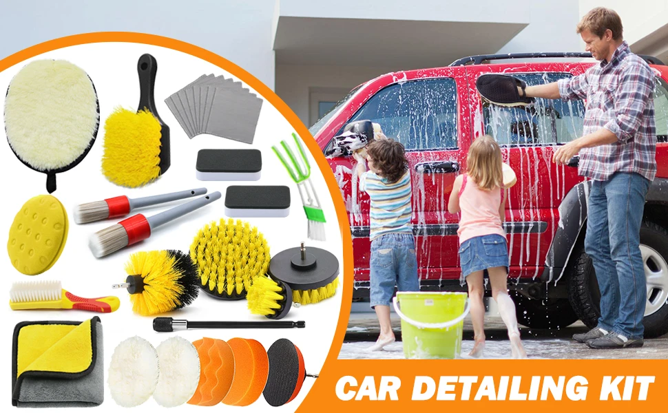- 【28PCS Car Detailing Brush Set】: Our 28pcs car wash kit including car detailing drill brushes*4, extension rod*1, car wheel brush*1, leather seat cleaning brush*1, upgraded detailing brushes*2, drill polishing pads*2, woolen polishing pad*2, suction cup*1, car washing glove*1, microfiber towel*1, wax applicator pads*1, air vent brush*1, ceramic coating applicator*2, microfiber suede cloth*8. The car cleaning kit is used for your car’s internal and external beauty and cleaning, basically meet your car wash needs.