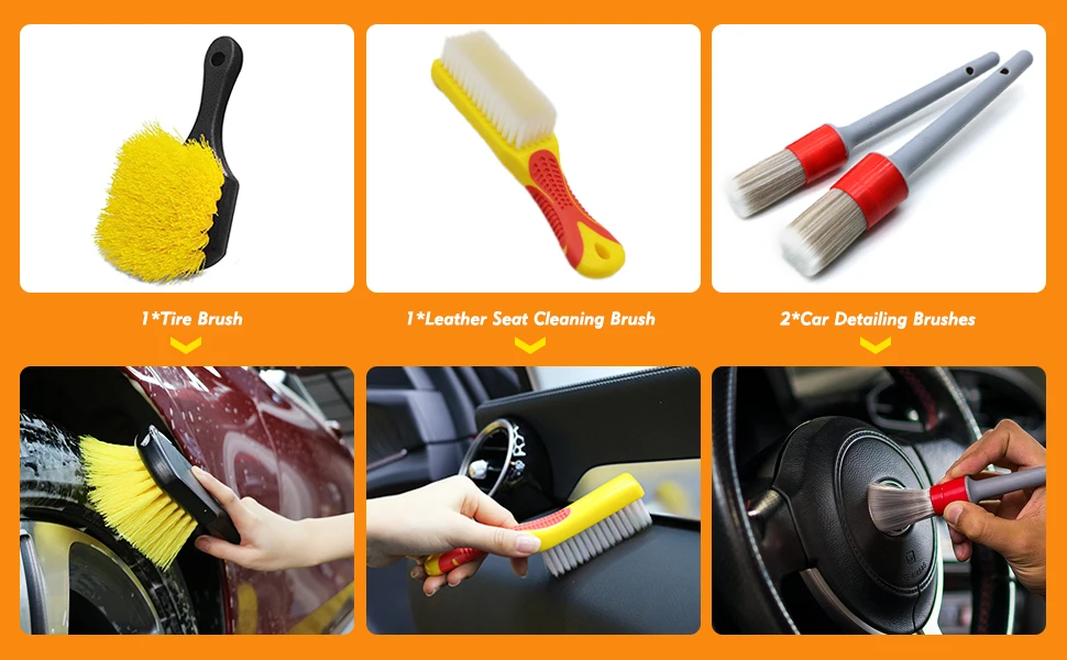 - 【1 x Car Wheel Brush & 1 x Leather Cleaning Brush】: The feather end of the tire bristles provides a safe and gentle cleaning and anti-skid handle to achieve a perfect grip. The leather cleaning brush is made of soft PE bristles, great for cleaning car leather seat, backrest, leather panel.