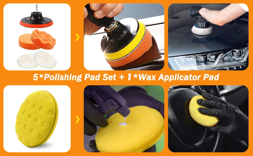 - 【4 x Scratch-Free Car Polishing Pads & 1 x Suction Cap】: The pads includes sponge polishing pads*2 and woolen buffer pads*2. They are bendable, washable and reusable. Both flat and wave designs meet different polishing needs. Great for auto car paint surface, headlights, car windows, etc. You can easily change the sponge with magic adhesive backing pad.