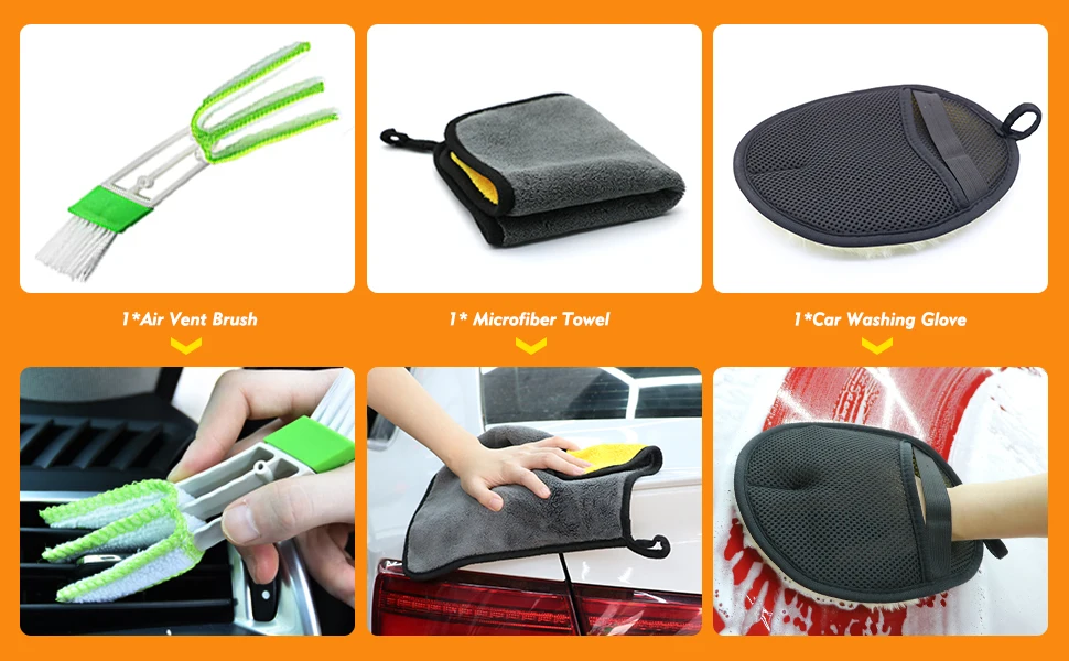 - 【6 Kinds of Car Cleaning Tools Kit】:Includes car washing glove*1, towel*2, air vent brush*1, wax applicator*1, ceramic coating applicator*2, microfiber suede cloth*8. The woolen glove and towel are highly absorbent and will not scratch any surface. The air vent brush is soft and can remove the dust from the vent, keyboard, shutter, etc. The wax pad is washable and reusable, suitable for cleaning car, furniture, porcelain, electrical appliances, etc. The ceramic coating applicator and suede cloth form a strong protective layer on the car paint, making it less likely to be scratched.